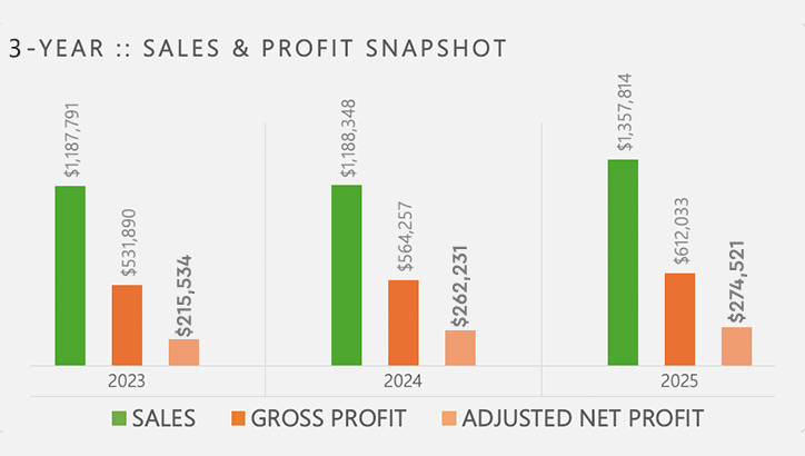 The $274,521 adjusted net profit is based on just one owner working an average of 25-28 hours per week — mostly handling admin, overseeing operations, and answering emails.